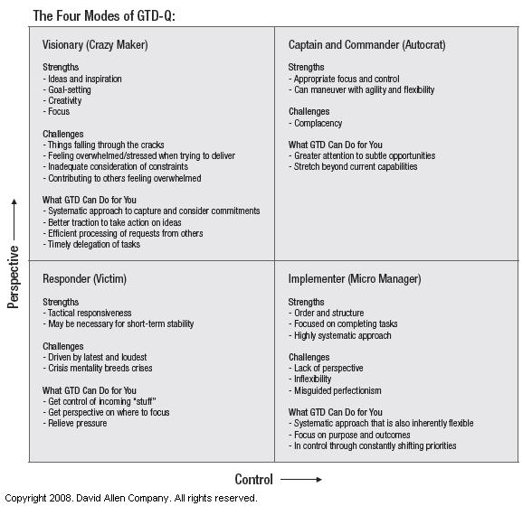 With the start of the New Year, this would be a great time to take the GTD-Q assessment. This free online assessment measures what Getting Things Done gives you: better control and greater perspective. It’s not one of those one-time tests that will never change (which will be good news for those of you who land as a Crazy Maker!). You are encouraged to take it often to see how it changes for you as you work with your strengths and challenges. If you want your results tracked over time, there is another version on GTD Connect.