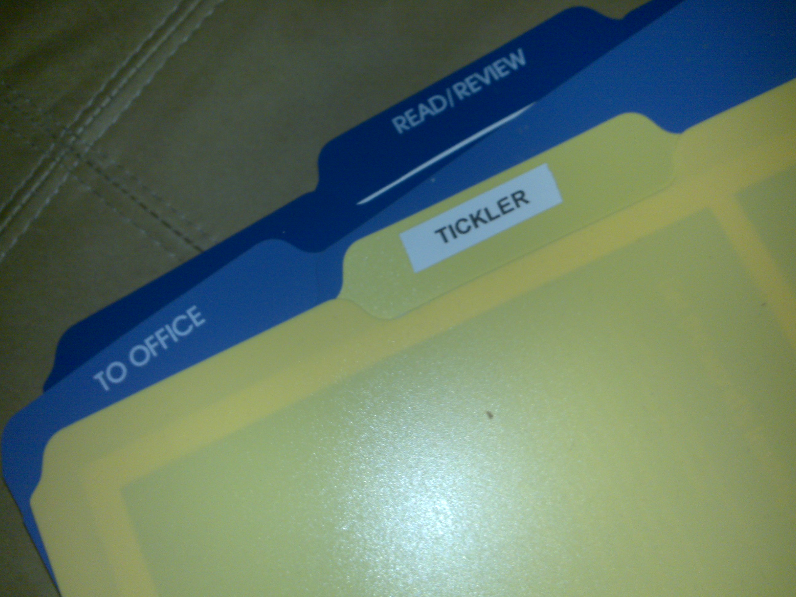 First let’s clarify what I mean by a tickler file: the tickler file to which I am referring is a distinct file folder (Mine says “Tickler” on it thanks to my trusty labeler) that contains items that are already processed but which are not yet complete and which have some need to be completed by a particular time.