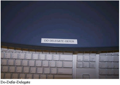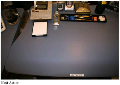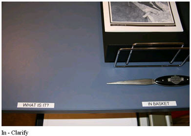 I cleared my desk and used my label maker to visually make areas of the desk to support how I work. So far this has helped me primarily stop to Clarify during processing. It helps me literally stop and determine Is it Actionable? If so, applying the clarifying activities of What is the desired outcome? and THEN, What’s the Next Action?
