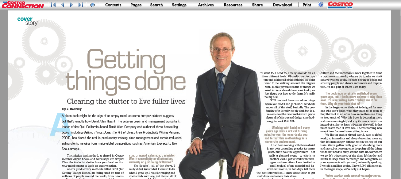 Thus, it is a tremendous honor for everyone involved with David Allen and the David Allen Company that David is featured on the cover of this month’s Costco Connection as well as in a multi-page article on the inside. It’s free so be sure to check it out!