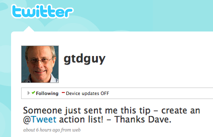 So if you are interested in what David has to say – or as Twitter says – “what David is doing” you should make it a point to go to Twitter and follow GTDGuy aka David Allen.