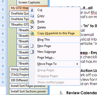 - Go to the page in OneNote where you want lighting speed access – “My GTD Weekly Review”, in this example.