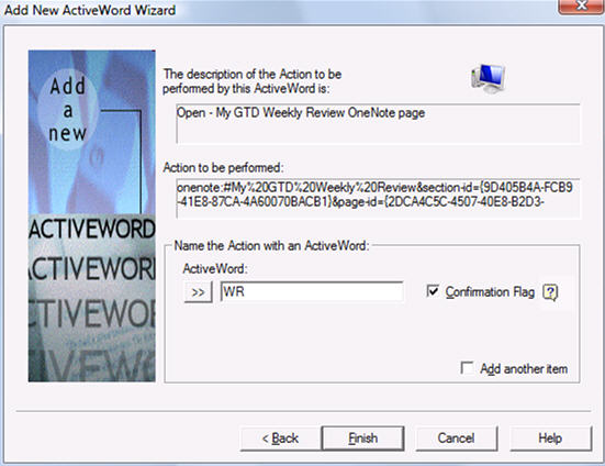 - Now determine your ActiveWord for this task – could be “GTDWR”, or “Weekly Review”, or something simple like “WR”. Then select “Finish”. (see screen capture below)