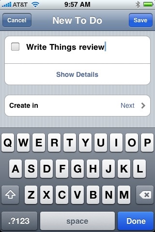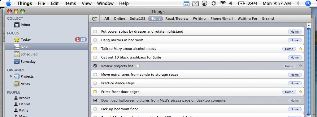 As David Allen said, the key to the system is that it’s with you all the time. Because of the iPhone sync, if my phone is with me (and it always is) my system is with me. The quick entry field lets me jot down a note in less than a minute if I’m at a restaurant, in a meeting, or otherwise away from the computer. Later, when the phone and computer are on the same wireless network, they sync. (One current drawback to the iPhone app is that is does not allow for my context tags, although Things developers have indicated the next update will have tags enabled.)