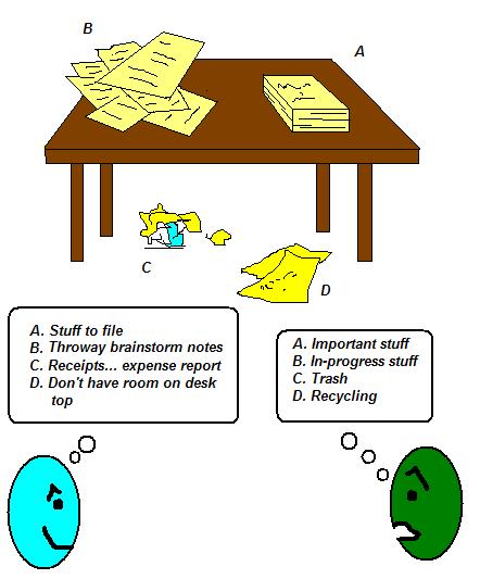 - The crumpled receipts and sheets of paper under the desk in the picture are not legible. A zealous janitor could be forgiven for trashing pile C and shredding pile D. If he’s been told to leave the desk area alone, it will acquire some coarse other-meaning for him (“not trash even if it looks like it”).