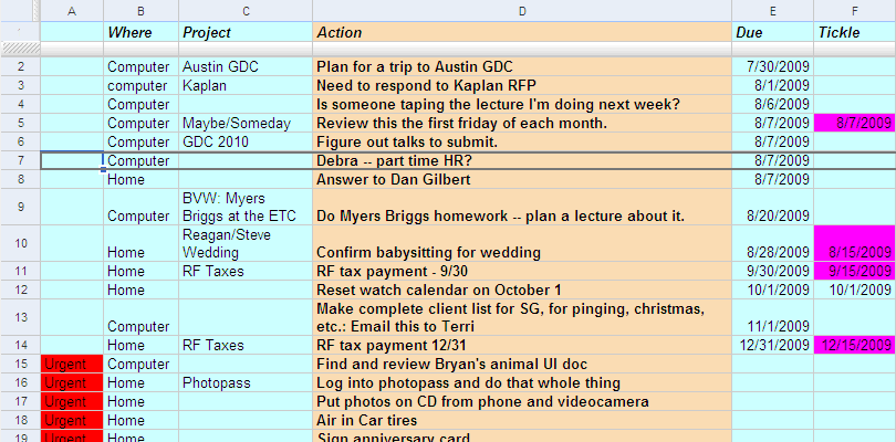 I use a Google spreadsheet too. Except that mine is far more rudimentary. Column 1: project, column 2: comma-separated list of ‘areas of focus’ tags that the project is relevant to, column 3: next action. I break with GTD theology a little bit: I have a 4th column called “hopper” where I capture any beyond-next actions, or unclarified placeholder actionish phrases. I have a dates column, but the default is =today(), and I set it to a hard date when necessary (either a deadline date or a tickler date), and have a rule that turns past due rows red.