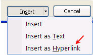 In Outlook 2007 the Insert feature no longer lists “Insert As Hyperlink” but you can still do this feature by right clicking in the message area of the task and selecting Hyperlink.