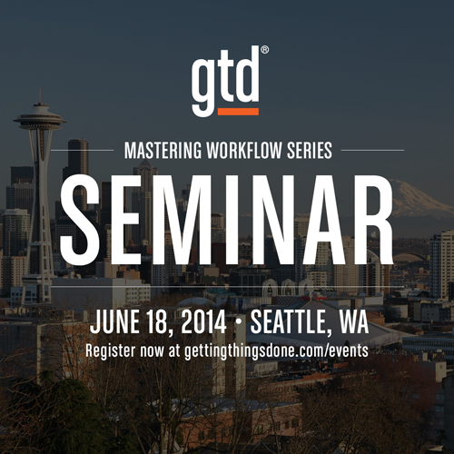 Join us in Seattle on June 18 for our Mastering Workflow Seminar. If you are just getting started with GTD, this is a good launch pad for getting your GTD system off the ground. If you have implemented GTD, this seminar is an opportunity to reinforce your foundation and see where you have gaps in your system.