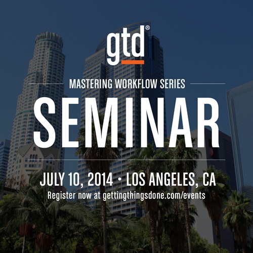 Join us in Los Angeles July 10 for our Mastering Workflow Seminar. If you are just getting started with GTD, this is a good launch pad for getting your GTD system off the ground. If you have implemented GTD, this seminar is an opportunity to reinforce your foundation and see where you have gaps in your system.