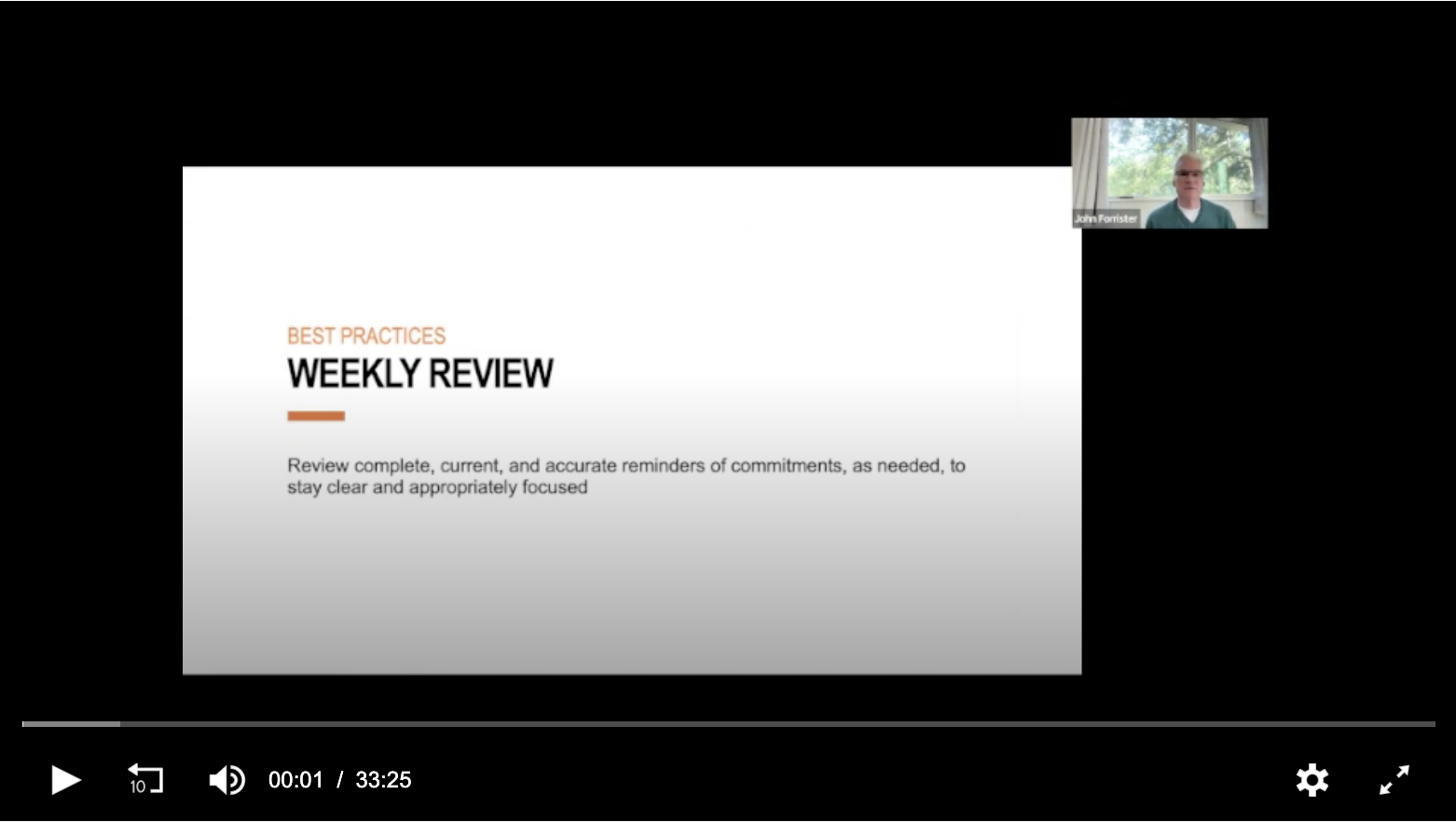 Are you among those who have not yet made the review a habit? Experience what David Allen calls the “critical success factor” with GTD, by going through a complete GTD Weekly Review. You’ll experience all 11 steps of the process, with helpful advice along the way. Please note: The silent time to work on each step is edited out. You can pause the recording on any step to suit your pace. For the clarifying diagram, you may find it useful to have the GTD Methodology Guides handy, from the top of the Tools and Templates section of the Document Library. You may find the Project and Next Actions Verbs PDF from that section of the library helpful as well. You may want to watch the Clarifying for Better Lists webinar replay to support your review habit.