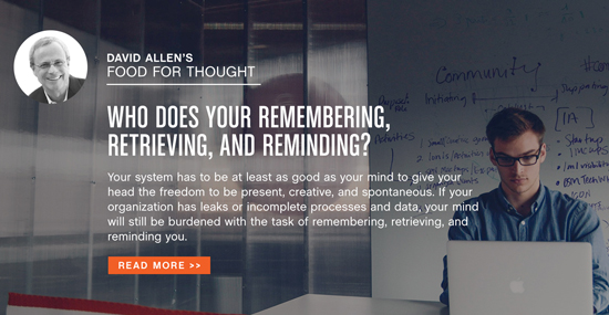 Who does your remembering, retrieving, and reminding? Your system has to be at least as good as your mind to give your head the freedom to be present, creative, and spontaneous. If your organization has leaks or incomplete processes and data, your mind will still be burdened with the task of remembering, retrieving, and reminding …
