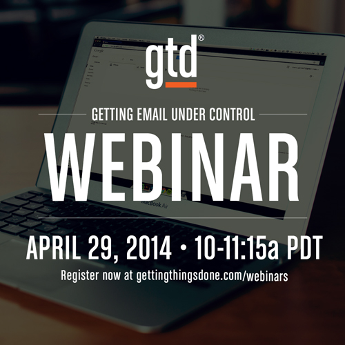Register now! Join us Tuesday, April 29 from 10-11:15 a.m. PDT, for our “Getting Email Under Control” webinar. We’ll focus on the keys for effectively managing email. You’ll learn strategies for dealing with backlog, the questions to ask to get “In” to zero on a regular basis, and tips for organizing actionable and non-actionable email.