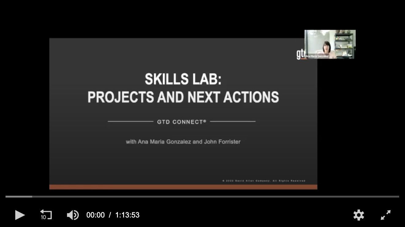 This was the first of several planned GTD Skills Lab webinars. In this installment, we focus on the fundamentals of projects and next actions. Through a set of fun quizzes, engaging practice scenarios, and lively group discussions, this is a valuable opportunity to fine-tune your GTD practice.