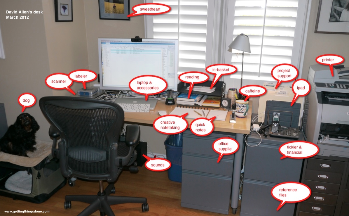 This is a photo of David Allen’s workspace. You’ll notice that he has helpfully labeled many of the items in the photo. Please click on the thumbnail to see the larger version of the photo, so you can see the details and read the labels.