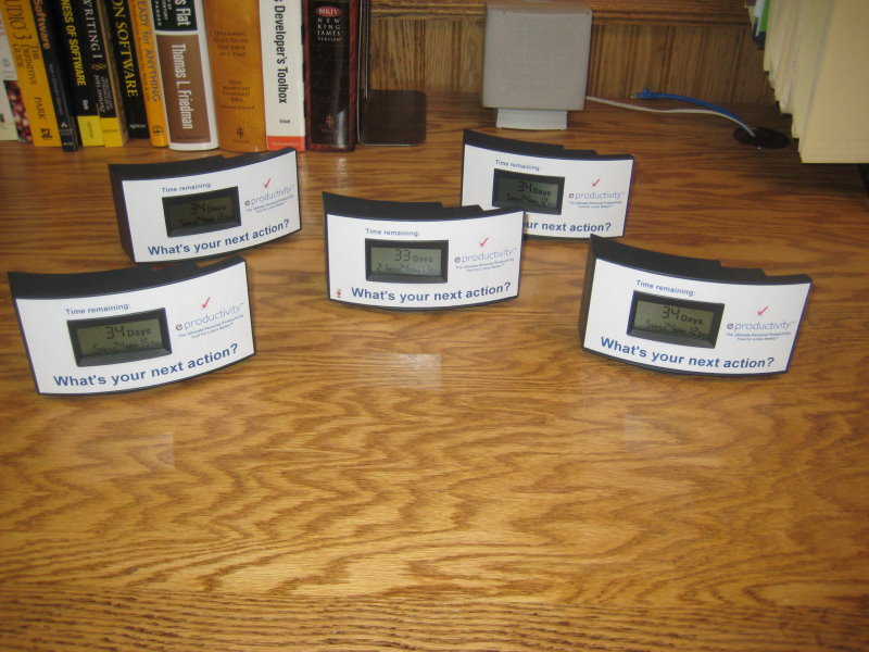 Starting with a countdown clock mechanism that I purchased on-line, I created a custom clock face and built five eProductivity countdown clocks. I set each one to the date of a key milestone. I kept one clock for myself and I sent the other four to key people on my team. Now, I have a tangible reminder of each event and the time remaining in which to complete it. I’ve had the clock on my desk for a few months now and it’s been a fun reminder of an event that I am looking forward to. The key question “What’s your next action?” keeps me focused on the little things that I need to accomplish to achieve my goal.